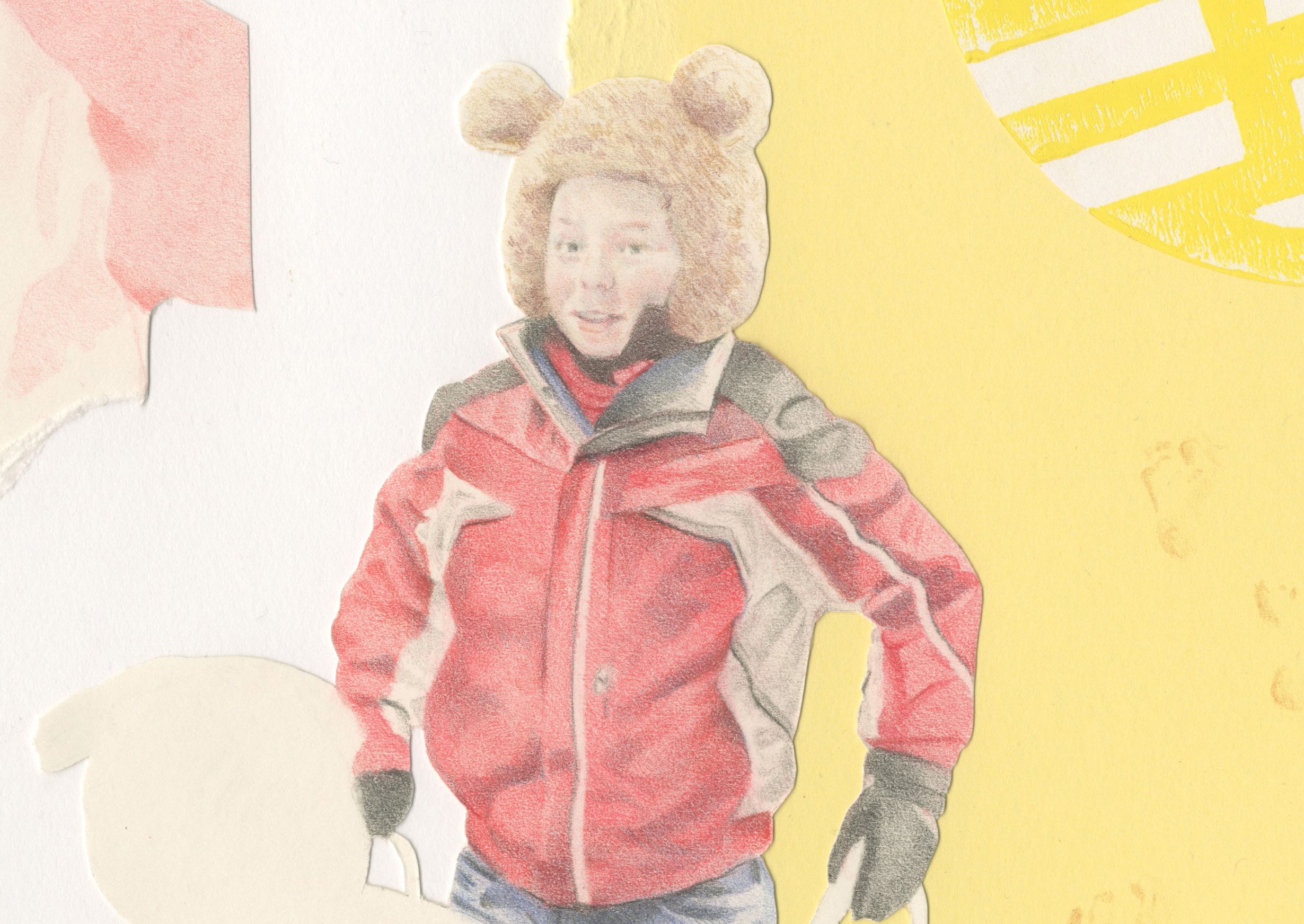 This piece suggests the differences in Spring spent at home in the UK, and a spring spent abroad in the French Alps. My early springs were spent in shorts and t-shirts, treading footprints in the sand of Bournemouth’s beaches. The early innocence of Winnie the Pooh is shown here too, in the delicate shades of yellow and red which adorned both mine and my partner’s early bedrooms.