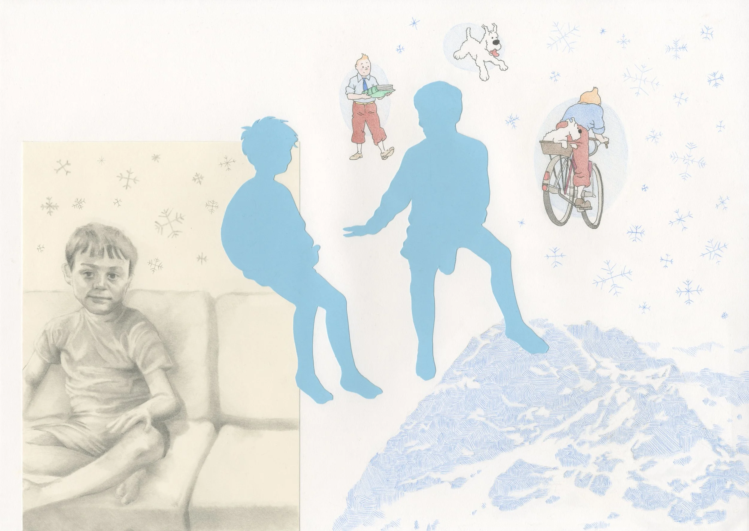 This piece serves nostalgia. The subdued colours and faded blues speak of snow and cold Springs. The cut-outs are based off myself and my partner as children, and lack our features to better represent the fact that we never met in our youths, and were therefore strangers. The destination of this image is the French Alps, a place my partner and his family (his brother drawn above) frequented often. In this way, I am encroaching upon his childhood, and yet his faceless image welcomes me heartily.